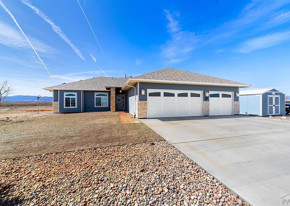 Beautiful 5 acre Ranch style home located between Pueblo West and Canon City. Backs up to a privately owned ranch with stunning views of the Wet mountains, Greenhorn mountain and Pikes peak. This like new house has some very great features including an owned Solar system and a whole home Eco water purification system with an R/O system. An oversized garage along with a great floorplan of the home is a must see! High end, energy efficient appliances including a pot-filler above cook stove. The driveway to the home is paved. Another great addition is 2, 20x10 outbuidings. A rare opportunity is this exclusive subdivision doesn't come along often.