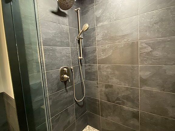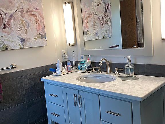 Master bath gut rehab 2020..large walk in shower with built in seat and cubicles, granite and tile walls, tiled floor with accent insert, furniture style vanity with marble top...$45,000 redo