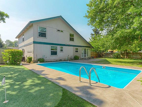 Great 4 Bedroom Family in a great East Medford location w/ in-ground pool! Vaulted ceilings in living & dining room, hardwood entry, floor to ceiling brick fireplace, lg newer vinyl windows, slider to backyard. Backyard with mature landscaping, putting green & vinyl lined pool. Updated kitchen w/ quartz counters, 5 burner gas cook top, stain less steel appliances, drop in sink, nice pantry w/ pull outs. Large bedroom on the main floor and 3 bedrooms upstairs with family room area. One large bedroom upstairs with balcony. 2 Car finished garage w/ RV parking. Seller is offering $7500 credit at close of escrow for updating.