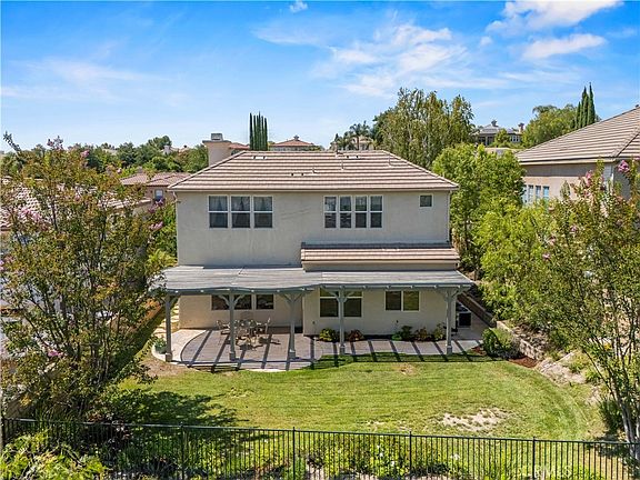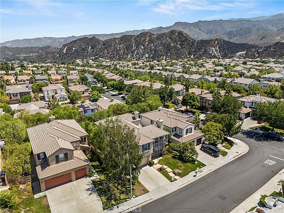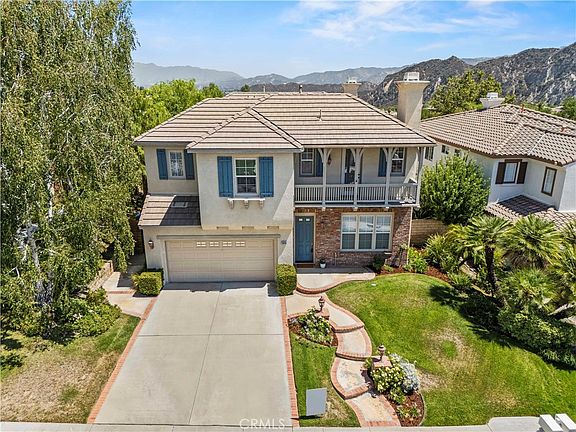 Perfectly positioned and move-in ready! Welcome to one of Stevenson Ranch’s most desirable neighborhoods, with an impeccably maintained Mediterranean-inspired home that offers over 3200 square feet of light and bright living space. It features 5 spacious bedrooms and 3 full bathrooms, including a full bedroom and bathroom on the main level, perfect for guests or multi-generational living. From the moment you arrive, pride of ownership is clear. A unique dual staircase anchors the expansive layout, which includes formal living and dining rooms, along with French doors that open to a private interior courtyard, ideal for relaxing or entertaining. Throughout the home, you’ll find wood flooring, newer luxurious carpet, recessed lighting, phantom screens, and custom touches that reflect true pride of ownership.The gourmet kitchen showcases granite countertops, a center island, pantry closet, double ovens, and newer stainless steel appliances. The bright breakfast nook opens to a spacious family room with a cozy fireplace, built-in media niche, and direct access to the tranquil backyard. Upstairs, the expansive primary suite offers a peaceful retreat, featuring a spotless ensuite bathroom with dual sinks, a soaking tub, separate shower, and a custom walk-in closet. Step outside to your entertainer’s backyard with no rear neighbors and enjoy scenic hillside views, year-round serenity, and plenty of space to add your dream outdoor features. Recent upgrades include newer air conditioning units, new hot water heater, new screens on windows, phantom screen doors. Also included is an upstairs laundry room, dual-zone A/C, two fireplaces, and a three-car tandem garage. All this in a prime location within walking distance of award-winning Stevenson Ranch Elementary and Richard Rioux Park, offering tennis courts, playgrounds, walking trails, open fields, and amazing 4th of July fireworks-or stay in your backyard and watch fireworks from home! Enjoy easy access to shopping, dining, and the freeway. Low HOA of $39 monthly and low Mello Roos set to expire in 2026. This immaculate, move-in ready home offers the perfect blend of space, style, and location.