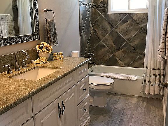 55+ Sun City Senior Community, Completely Remodeled. 3 bedrooms 2 baths, new windows, new laminate flooring throughout, oversized master bath with new tiled walk-in shower, a walk-in master closet, granite countertops in both kitchen & bathes, new stainless appliances with a gas stove. Newer vinyl fencing, new concrete driveway, side yard & back patio. RV parking, & huge double deep 2 car garage. New front landscaping with low maintenance yard. Roof replaced approx 3 yrs old. All new plumbing, NO old cast iron plumbing. New electrical panel, and so much more:) NO AGENTS PLEASE. Drive by only till July 1, call to schedule a appointment for a private showing.