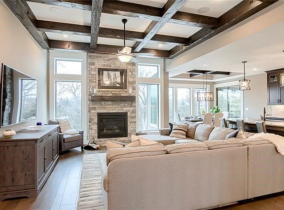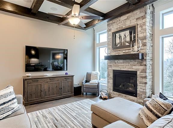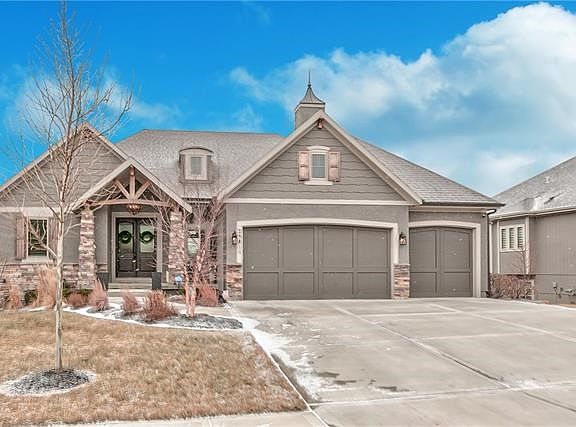 Beautiful, maintenance provided, Gunnison Reverse 1.5 story, 4 bedrooms and 4 full baths with easy flow open floor plan. Entertainer's delight featuring 3 outdoor gathering areas. This impeccably maintained, better than new home complete with surround sound on the main level. Enter through stunning double doors into the welcoming entry and beamed great room with a floor-to-ceiling stone fireplace and huge windows for lots of natural light and a great view. Adjacent to a well-appointed eat-in kitchen with granite countertops, SS appliances, and a unique butler's pantry with floor-to-ceiling shelves and cabinetry for storage. Walk out to covered deck with stone FP and ceiling fan overlooking fantastic, newly extensively landscaped, extended and lighted, large yard backing to woods for nighttime enjoyment. Relax in the high-end hot tub as well as the Pergola lighted patio with 3rd wood-burning FP. Walk out of the finished lower level recreation room with a large walk-behind bar, wall of windows to the large covered patio with stone FP/pizza oven. The lower level also includes two secondary bedrooms, two full baths as well as two storage rooms, one including a safe room. Main level private master retreat with soaring ceiling and spa-like bath, huge walk-in closet with a wall of shelving, large shower, and free-standing tub. This level also has a second bedroom or would be a great office. The custom garage features an epoxy floor, brick accent wall,3rd fridge and is complete with heat and air! 4 mounted TVs and custom wood shutters make this beautiful home, one to be proud of!! Great location and easy access to K-7 and K-10!