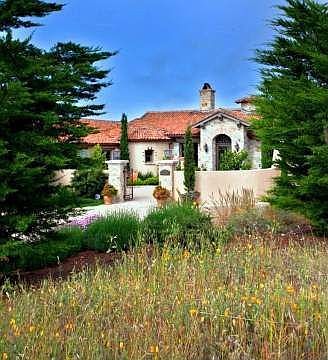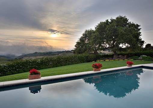 This elegant country home is designed for privacy while enjoying panoramic mountain vistas looking South to Carmel Bay. The estate is privately located on a 6.09 acre parcel, just a short drive from the Tehama clubhouse and fitness center. The home is adorned with fabulous antique 18th and 19th century roof tiles and limestone pool decking all imported from Italy. Wonderful indoor-outdoor spaces create a warm atmosphere for entertaining. The spacious outdoor covered terrace encompasses over 510 square feet and features a stone fireplace. Enjoy a sparkling swimming pool and hot tub – designed with a state-of-the-art treatment system that does not require chlorine. The outdoor kitchen area includes a BBQ with built-in DCS rotisserie gas grill and refrigerator. The grounds are luscious! A tranquil french fountain greets you in the entry courtyard. Flowers, citrus, and flowing bougainvilla accent custom wrought iron window details and front entry door. Interior details feature solid beamed ceilings in every room, custom plaster detailing and hickory hardwood flooring. The fully appointed kitchen with cherry wood cabinetry, caeser stone counters and top-of- the-line appliances includes an large curved counter with stools—inviting guests to mingle with the chef. Custom tile work and hand painted wall accents accentuate the residence. The master bedroom is perfectly situated to provide incredible views of the valleys and mountains that grace this enchanting Tehama property.