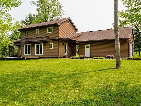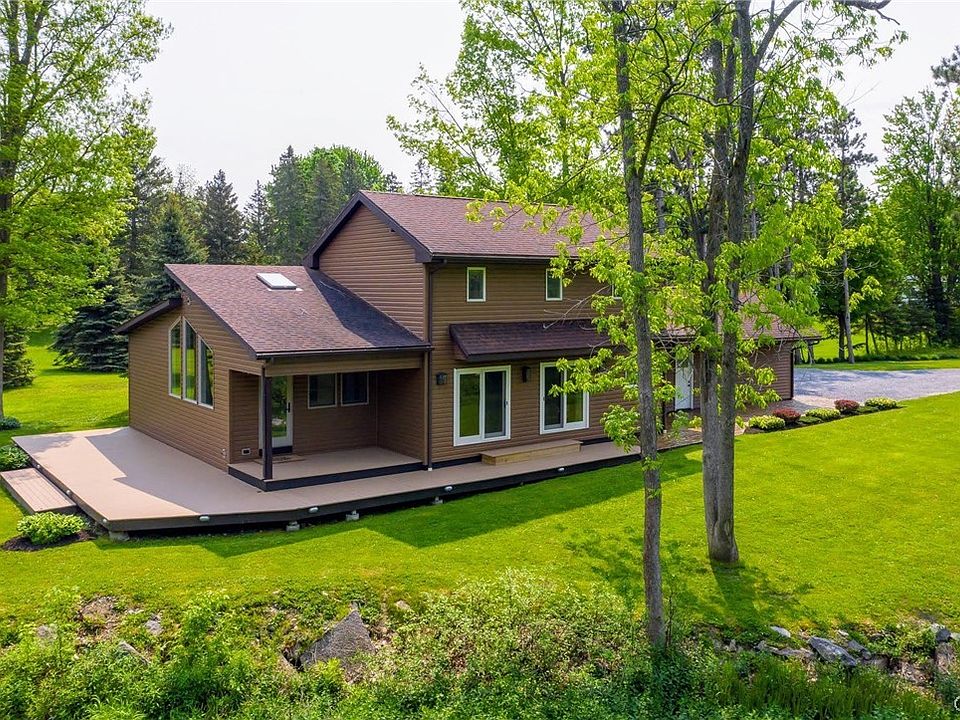Shhh ... it's almost a secret - who would have thought this great property with privacy and seclusion was tucked away off Rte 3 just outside the city towards Black River! This 3 bdrm, 2 1/2 full bath contemporary home offers you that much sought-after open "great room" concept, plus... there's a large family room with beautiful windows overlooking your very own serene setting. The living and dining area provides additional access to the wrap-around deck with a double set of sliding glass doors. Travertine tile floors and granite counters in the kitchen, plus the kitchen has a great pantry/closet area. Tongue & groove whitewashed pine ceilings in the family room, first floor Master bedroom with a large walk-in closet and private bathroom. The second floor can easily swap for a second Master bedroom if need be, as it connects to the 2nd floor full bath plus the third bedroom is close by. Stamped concrete breezeway, attached garage plus an additional storage building out near the end of the driveway for all your extra equipment. Great property conveniently located between Watertown and Ft Drum - don't wait... Call, Click, or text today for an appt to see !