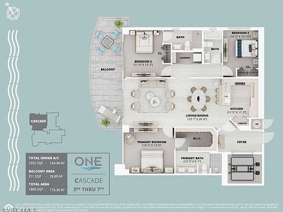 Enjoy an unmatched aura of privacy with our exclusive selection of ONLY 34 Condos in our boutique high-rise with 21 stories. The CASCADE is a 3 Bed/ 3 Bath Condo with an open floor-plan concept and the primary bedroom on the opposite site of the guest suite, for extra privacy! 2 covered parking assigned + plenty of guest parking. Coupled with the riverfront views, these exquisite interiors provide a ONE-in-a-million lifestyle. Premium Viking appliances and gas cooktop in a chef-inspired kitchen, High ceilings with expansive windows facing the riverfront for breathtaking views, European-style cabinetry, Quartz waterfall kitchen island, Glass walk-in showers with free-standing tubs, Expansive balconies with glass railing for uninterrupted vistas. With upscale amenities comparable to some of the world’s top resorts, ONE raises the bar as the only true boutique high-rise in Fort Myers. Infinity edge pool with a cascading waterfall, Rejuvenating Whirlpool, Expansive pool deck with lounge chairs & cabanas, fire pits, Chef-inspired cabana BBQ, fitness center, Private riverfront kayak launch area & storage, Pet grooming salon, Private owners lounge & Owner’s Club Room.