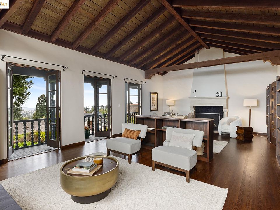 Designed by Walter Ratcliff, chief architect for the City of Berkeley in the early 20th Century, this extraordinary 1929 Mediterranean combines exquisite design and craftsmanship, lush and lovely gardens, and sweeping North Bay views. Beyond the secluded courtyard entry, the grand foyer introduces the architectural themes: soaring spaces, rich wood beams and details, leaded glass, and intricate ironwork. Ascend the open staircase to the magnificent Great Room with vaulted ceiling, sculptural stone fireplace, and floor-to-ceiling French doors to its balconies and vistas. Like the Great Room, the adjacent library/study is lined with handsome bookshelves. On the main level, the family room opens east to the courtyard and west to the tastefully updated kitchen open to a generous dining area with a balcony and treetop bay view. Two charming view bedrooms, one with a fireplace, and an artfully tiled hall bathroom complete the main level. Below, down a graceful, open staircase, the large and light-filled primary suite opens to the rear deck and leafy garden patios anchored by a towering redwood tree. Lovingly maintained over many decades, this uniquely beautiful home invites lovers of architecture to this very special neighborhood close to all North Berkeley pleasures.
