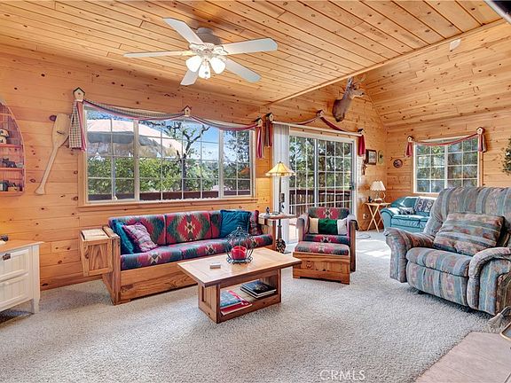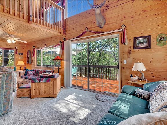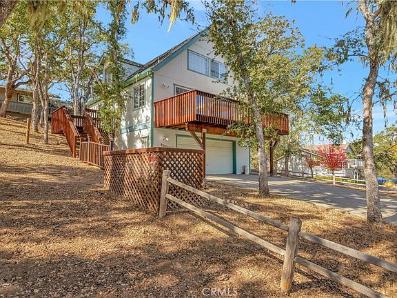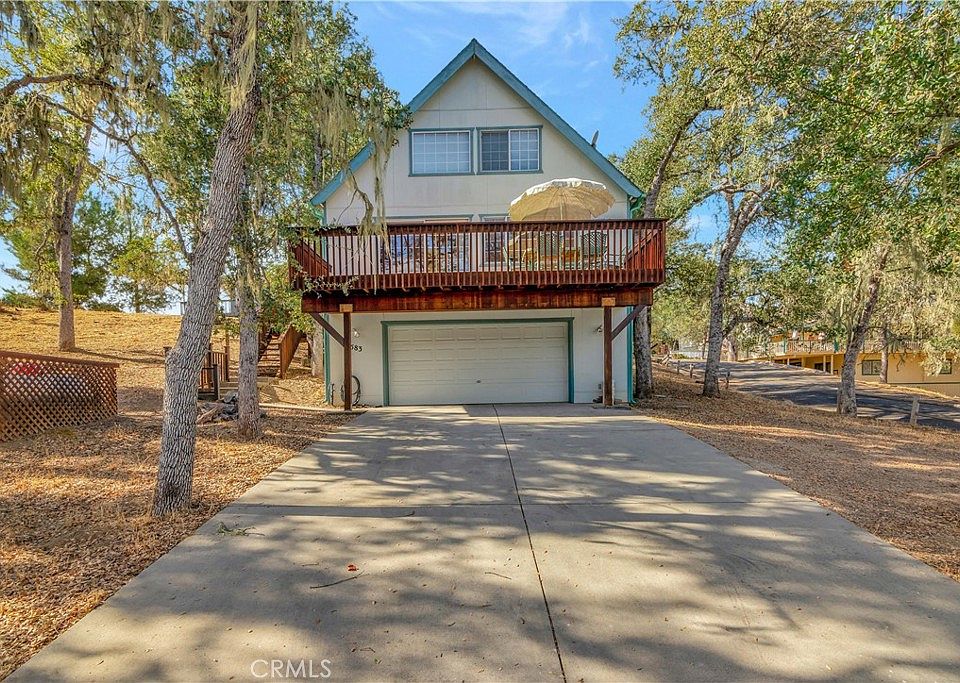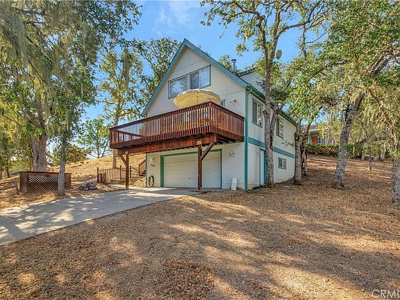 Nestled in the serene community of Oak Shores, this charming 1,092 sq ft cabin graces a spacious 6,700 sq ft corner lot. Step into the inviting main level boasting an open floorplan, seamlessly integrating the living room, dining area, and kitchen around the cozy wood burning fireplace. A full bathroom adds convenience, while front and rear decks beckon for outdoor enjoyment. Ascend to the upper level, where two bedrooms and a loft provide comfortable accommodations. An additional full bathroom ensures everyone's comfort. Currently set up to sleep six, this cabin is perfect for family gatherings and weekend getaways. Fully furnished! A 29 ft deep garage with a 7 ft tall door caters to your boat storage and parking needs. From the rear upper deck, you'll catch glimpses of Lake Nacimiento, adding to the cabin's allure. Embrace the tranquility of Oak Shores in this delightful retreat!