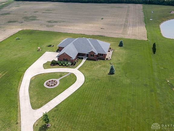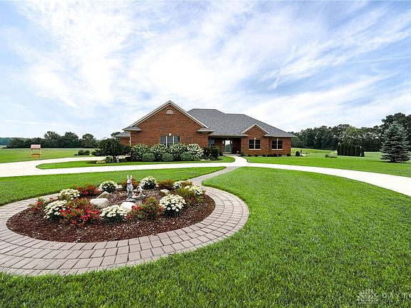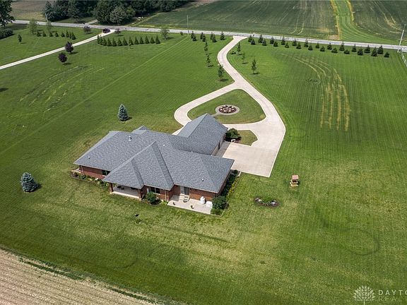 Custom built, high quality, full brick ranch was built in 2017 and sits on 5.7 acres near Troy, Miami Co. Plenty of space with 3,314 sq ft, featuring 4 bedrooms, 2 are primary suites at opposite ends of the home, and 3.5 baths. One primary has a walk-out patio, jetted tub, separate shower, with electric in one of the closets for a microwave/mini-refrigerator. Great room boasts a gorgeous stone fireplace (Gas, propane fueled) makes a wonderful focal point. Built-in bookcases have glass doors and IV cabinet. Primary bedroom suites offer walk-in closets, tile showers with wood benches, (one soak tub), and electric heaters. Kitchen features granite countertops and maple, custom cabinetry. Under cabinet lighting. Mudd room offers wood benches. Basement entry offers 4’ stairs, finished drywall walls and ceiling with recessed lighting. Needs only finishing touches to make it your own. Three rooms plus bathroom. Plumbed for kitchen, full bath. Basement access from main level and garage. Steps going to/from basement are extra wide and deep. Basement plumbed for another kitchen sink, plumbing and electrical is in to set up another stove, refrigerator, dishwasher, and microwave. Additional storage offered in the concrete crawlspace. Generator. Geothermal HVAC features 3 zones, 2 sump pumps, 1 for exterior perimeter of home. Dusk to dawn lighting. Covered rear patio. 3 car garage is extra wide and deep and features a sink in the garage and floor drains under each parking area. Home has beautiful landscaping and a driveway monitoring system! No lease for farmer, access needed to harvest. This home is a top of the line home with lots of features. Book your appointment now!