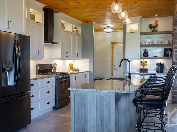 Modern elegance meets rustic charm on this exceptional waterfront property. This turnkey home offers an open concept main level with hardwood flooring, exposed stone & wood beams creating an inviting atmosphere. The chef's kitchen boasts a large sit-at island, stainless steel appliances & a walk-in pantry adjacent to your convenient partial bath with laundry facilities. The connected dining room is bathed in natural light & opens to a spacious deck, while the living room features a gas fireplace & large windows overlooking the serene waterfront. This home presents 1 luxurious 5-piece bathrooms, 3 spacious bedrooms including the primary with relaxing 5-pieces ensuite and 2 walk-in closets. Downstairs offers an in-law suite with walkout, completed with an open-concept kitchen, dining & living area, 3-piece bathroom, 2 additional bedrooms & patio doors to the 2nd deck. The outdoor space is a true paradise, featuring a generous yard & easy water access. Driveway will be asphalted!