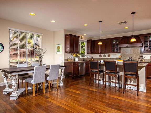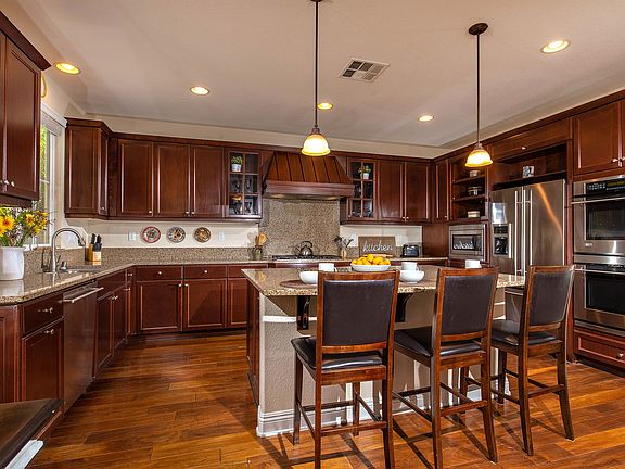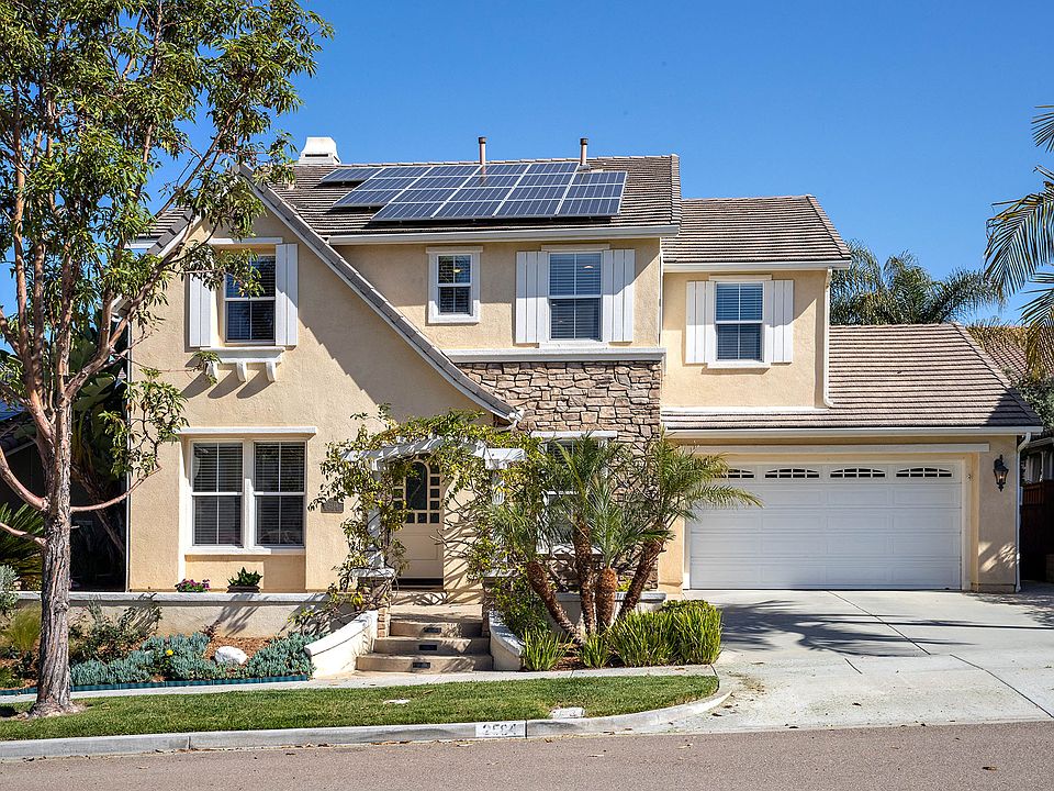 Great new price! Reduced over $25,000! Elegant home with owned solar in highly desirable Bressi Ranch. Located on a quiet tree lined street that is walking distance to fantastic shops and restaurants at the Bressi Ranch Village Center. This luxurious residence features a gourmet kitchen with expansive center island, top of the line GE Monogram appliances, double ovens, granite countertops, walk in pantry, built in desk, and breakfast area. The kitchen flows seamlessly into the expansive family room with raised hearth fireplace and built in speakers. The spacious master bedroom suite features dual basins with mosaic travertine backsplash, a soothing soaking tub, an oversized shower, and a huge walk in closet. Outdoor spaces include a peaceful backyard with grassy area, covered patio, brick terraced garden area, and pondless waterfall. There is a wonderful upstairs loft that could easily be converted to a 5th bedroom. One of the upstairs bedrooms is extremely spacious with room for a seating area, and could be perfect for siblings who share a room. The upstairs hall bathroom features dual basins. A bedroom suite is conveniently located on the first floor with attached bath and walk in closet. Gorgeous walnut wood floors can be found throughout the downstairs with neutral carpet upstairs. Stylish paint colors highlight many of the private rooms with neutral paint colors in the public rooms. Other features of the home include a 3 car tandem garage, upstairs laundry room with sink, tall baseboards, dual AC, and multiple rain barrels. 19 panel solar is 3 years new, and carries a warranty for 17 more years. Owners had zero electric bill each month, and received a $35 credit with solar at the end of the year. Residents enjoy a resort style community area with pool, spa, children's wading pool, and BBQ areas. Students attend top rated Carlsbad schools. Minutes to beautiful beaches and world class golfing. Come live the ultimate Southern California lifestyle!