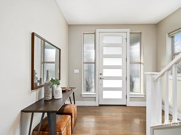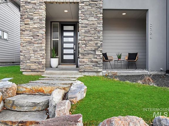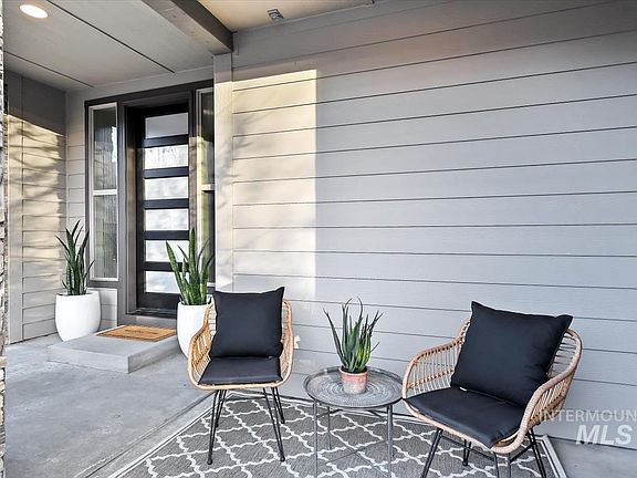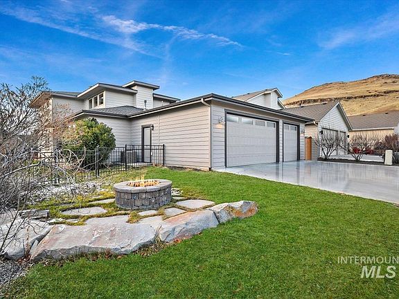 Ideally situated on a quiet street in desirable Harris Ranch, this sleek, modern residence draws you into an impressive interior warmed by rich hardwoods and calming neutral tones throughout. Soaring ceilings and walls of windows flood the great room with natural light offering a bright and airy backdrop for entertaining and relaxing by the gas fireplace. Generous great room flows seamlessly into a well-appointed kitchen boasting custom granite countertops, oversized island, double oven and gas stove, perfect for the chef of the family! Escape to the main-level master featuring a lavish ensuite with tiled walk-in shower, soaker tub and large closet. Unwind beneath the covered patio or host an evening bonfire in the outdoor fire pit surrounded by natural stone seating, oriented to take advantage of foothill views. Don't miss the rare 3 car garage complete with built-in air compressor, hose bib and driveway space! Enjoy the E. Boise lifestyle just minutes from the Greenbelt, Boise River, trails and restaurants!