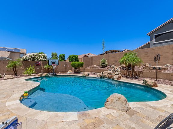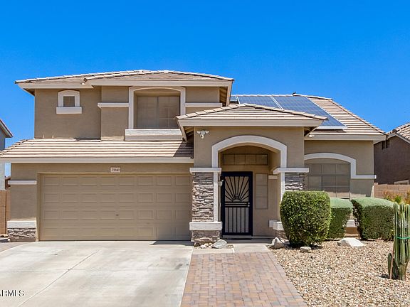 Home for sale in WestPark subdivision of Buckeye, AZ. This home features 3 bedrooms, 2.5 bathroom plus a loft. This 2 story home sits on a cul-de-sac street & comes with travertine flooring & vaulted ceilings. Spacious kitchen with plenty of cabinets & counter space, kitchen island, granite counter tops, black & stainless steel appliances & pantry. Master bedroom has double sinks. Check out the back yard oasis - swimming pool w/Baja shelf & water feature, travertine decking, built in BBQ grill & brick smoker for smoking delicious brisket for dinner. Insulated garage door & mini-split in garage, built-in cabinets & workbench. AC unit is only 4 years old. Save money on your electrical bill with solar panels.