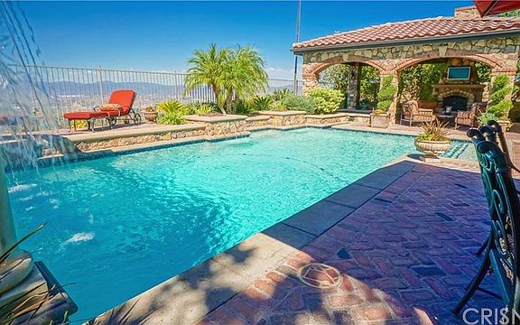 THIS TORCELLO IS NOW CUSTOM! Premier location at the top of Stevenson Ranch with views of the Ventura County line. Unmatched in high end upgrades, this pool home is an entertainer's dream with the desirable master down that is so hard to find. Exterior is loaded with extras - custom brick & stone, iron gates to courtyard, sunken BBQ area with stainless appliances & swim up pool bar, custom villa/gazebo with 16 foot fireplace, spectacular pool & spa with views & privacy, outdoor shower, exceptional hardscape - just incredible! The inside is also completely redone and customized. Venetian plaster, 22 inch Walker Zanger Italian tile, stainless Thermadore appliances, granite & tumbled tile backsplash. Shutters and quality draperies throughout. Custom French doors in living room lead to Pool. Baths in granite, tumbled stone flooring and Milgard windows are new this year. Iron staircase, molding, closets with built-ins - everything that could be improved, has been improved. Floor plan lays out with 3 bedrooms (including Master) down with 2 bedrooms plus large loft up. A ONE OF A KIND PROPERTY!