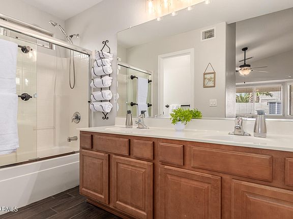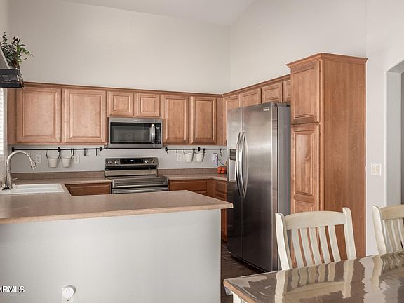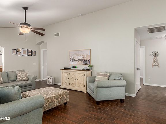 Enter into a house where every corner feels like home! New tile floors (No Carpet!), new baseboards, vaulted ceilings, smart thermostat, and freshly painted interior that bring vibrancy and warmth to each room, including the den paired with glass-inset French doors and built-in bookcases. The kitchen provides stainless steel appliances, ample cabinets with crown moulding, and a convenient breakfast bar. Spacious primary bedroom with a sunny bay window seating area, attached walk-in closet, and a private bath. Outside, enjoy the beautiful Arizona sunsets from the extended patio overlooking the fresh grassy area, raised planters, remote controlled landscape lighting, sheds, and newly painted exterior. This move-in-ready energy-efficient haven is perfect for the next chapter of your life!