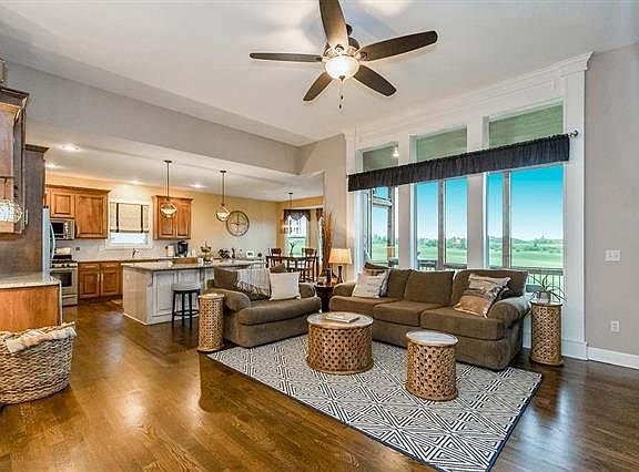 STUNNING REVERSE 1.5 BACKS TO 2nd HOLE AT PRAIRIE HIGHLANDS! Enjoy gorgeous fairways & green space for unique privacy nestled within the n'hood * Beautiful open plan w/ soaring ceilings & refinished hardwoods on main level * Massive kitchen island great for entertaining in amazing kitchen in today's style * Walk out to screened-in deck to overlook large, fenced back yard * Private office or 2nd BR on main level * Huge finished walkout LL w/ wet bar, 2 bedrooms & full bath * You'll love the view from any window!