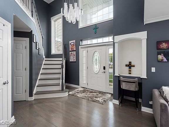 Welcome to this stunning, entertainment-ready home tucked away on a quiet cul-de-sac in the highly sought-after Autumn Grove subdivision, served by top-rated Naperville District 204 schools. Step inside the two-story foyer with hardwood floors throughout the main level, beautifully gray-stained and paired with custom trim, pillars, crown molding, and freshly painted walls. The open-concept kitchen boasts quartz counters, a full quartz accent wall, an island, and updated stainless steel appliances-perfect for both daily living and hosting. Upstairs, you'll find four spacious bedrooms, a conveniently located 2nd-floor laundry, and beautiful laminate floors. The vaulted ceilings and large windows bring in abundant natural light. The fully finished basement is a showstopper, featuring a media/theater room, recreation space, 5th bedroom, and full bath-ideal for guests, hobbies, or movie nights at home. Step outside to your private backyard oasis complete with a saltwater in-ground pool, large, fenced yard, and plenty of space for summer gatherings. An epoxy-finished garage floor and a security video system add both function and peace of mind. Major updates include: Roof & Gutters (2017), Siding (2016), Water Heater (2019), AC (2021), Furnace (2022), and Pool Motor (2020). Located minutes from shopping, dining, the Eola Rec Center, Metra, and highways-this home truly has it all!