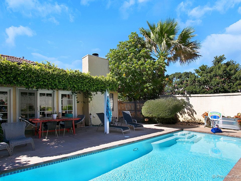 Rare opportunity to live in a single level, 3 bedroom twin home that lives like a single family home! AND, with your own private backyard WITH POOL and lush landscaping! Located on a corner lot, this home boasts an upgraded kitchen with gorgeous granite countertops and upgraded cabinets, beautiful stone and Brazilian hardwood floors throughout. Private courtyard entrance with custom wood gates and entry door. Two separate, private outdoor living areas!