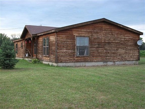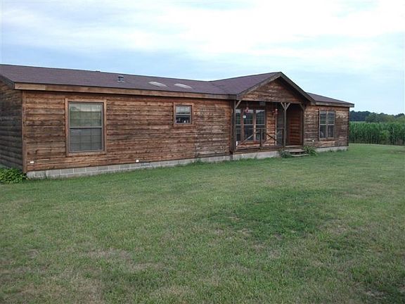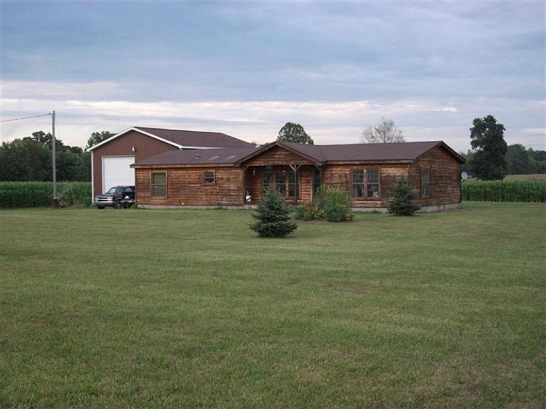 Acreage, pole barn and a 1998 partial log double wide, 3 bedrooms(Master suite with large master bath, garden tub, large shower and 2 sinks), large living room with cathedral ceiling and stone wood fireplace(one wall partial log), kitchen with many cabinets and eating area,(appliances included in sale), 2nd full bath with tub and shower, laundry room(washer and dryer included in sale), 32 X 40 pole barn with loft and 12 foot sides. Back deck overlooking property, large yard, land has been rented to local farmer, east line of property is a county drainage ditch.