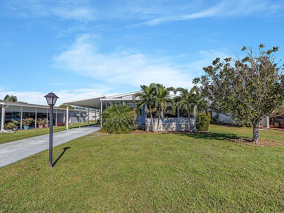 Welcome to your new home in St Lucie Falls community 55+ just off I95, Bring your Boat or RV. This is a Land Owned lot. Subdivision has 2 Clubhouses with pools, 1 heated, Shuffleboard, billards, gym, library, tennis courts, boat ramp, storage for boats/rvs. This home has been recently updated with gray colored laminated flooring in main areas, has newer carpet in bedrooms, master bedroom includes a walk-in closet, dual sinks and a walk in shower, 2nd bedroom has walk in closet, tub/shower in main bath, seperate laundry room, large kitchen with breakfast area, formal dining area and screened in patio. Call me now to view, won't last.