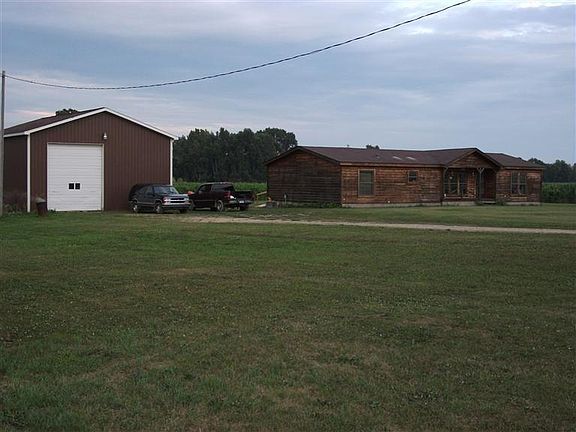 Acreage, pole barn and a 1998 partial log double wide, 3 bedrooms(Master suite with large master bath, garden tub, large shower and 2 sinks), large living room with cathedral ceiling and stone wood fireplace(one wall partial log), kitchen with many cabinets and eating area,(appliances included in sale), 2nd full bath with tub and shower, laundry room(washer and dryer included in sale), 32 X 40 pole barn with loft and 12 foot sides. Back deck overlooking property, large yard, land has been rented to local farmer, east line of property is a county drainage ditch.