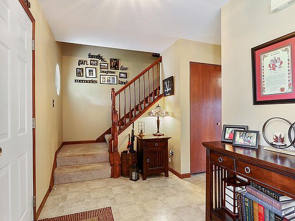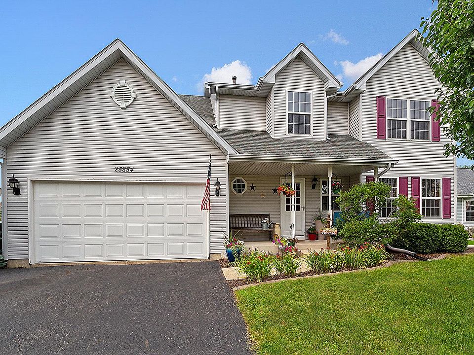 Relax on your beautiful front porch and welcome guests into a beautiful two story home featuring three large bedrooms plus huge loft (which could be 4th bedroom if needed) on a large lot. Open concept on main level featuring vaulted ceilings and lots of natural light. Large eat-in kitchen with sliding door that leads out to 23 x 16 deck and one of the largest lots in subdivision. Eat in kitchen features cherry finish cabinets and newer high end stainless steel appliances including a double oven. Nice size master bedroom features neutral carpeting, ceiling fan and raised ceiling and also private bath with ceramic tile and double sinks. Basement is partially finished and features a dry bar with granite counters and custom stone backsplash (perfect for entertaining) . Also has a custom painted mural on one of the walls. Plenty of extra storage in the unfinished area and also included is the washer/dryer. Maintenance free siding and a 5 year old roof!!! This home is wonderful and waiting for the new buyer!!!