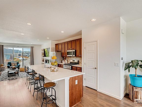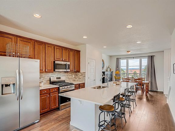 Gorgeous town home! Hardwood floors compliment this open concept floor plan on the main level. Enjoy the beautiful kitchen complete with stainless steel appliances, tile back splash, kitchen island, and pantry. Formal dining room and family living room flow off of the kitchen for a great entertaining space. Walk onto the Trex decking balcony form the living room. Upstairs includes the master bedroom and 3/4 master bath featuring double sinks and a walk-in closet. An additional bedroom and full bath finish the upper level. Great location that is close to shopping, walking trails, and convenient access to I-25. Must see!