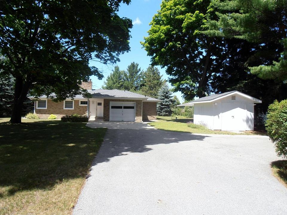 This immaculately maintained brick ranch home comes with 100' private sandy beach frontage on Lake Michigan plus a long concrete driveway providing privacy from roadside. Entertainment spaces and bedrooms all enjoy views of the Lake. East-facing kitchen, accessed by covered entry/patio area is a spacious light-filled space offering extensive cabinetry plus snack bar. Bedroom/bath area of home is heated by hot water heat while kichen and entertainment spaces are warmed by radiant heat. What i s especially significant is the the home sits 123' back from bluff edge, thereby allowing future owners freedom to make additions to stucture, if they so chose, while remaining within guidelines of Filer Township Zoning setback rules. This home is truly ready for immediate occupancy.