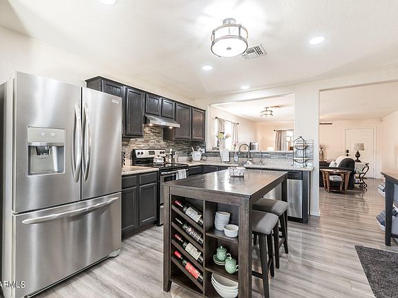 Beautiful 3 Bedroom, 2 Bathroom home in Buckeye. Lots of modern details throughout. Kitchen has granite counter, dark oak cabinets, stainless steel appliances, beautiful backsplash and breakfast bar. Dining area leads you to the open backyard with lots of potential. Laminate flooring throughout home and carpeting in all the rooms. This home is move in ready! Schedule a showing today.