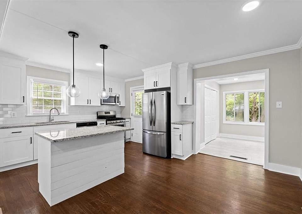 - Features: Cabinets White, Kitchen Island, View to Family Room