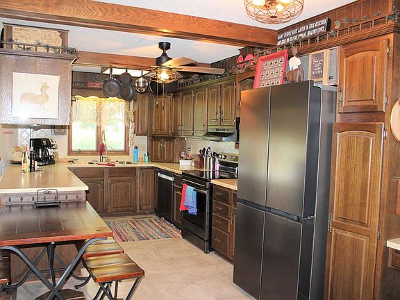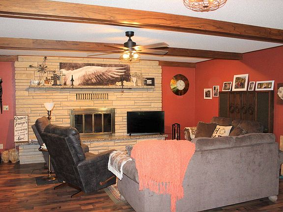 This one has it all! Beautiful Brick Ranch Style Home with 2 main floor bedrooms, 3 non-conforming lower level bedrooms and 3 baths! There is room for everyone, including extended family visits. The spacious open floor plan includes an entry, breakfast area, dining area, open kitchen with sleek contemporary updated appliances, and comfy living room with wood burning brick fireplace. This space extends out onto a 4 season sunroom with auxilary heat & air. Also on the main floor is an oversized laundry room with lots of storage and laundry sink. The high ceilings and barn wood look walls in the basement showcase a recent complete remodel with a bar, gaming area, 3 non-conforming bedrooms, an office space, bathroom, and great family room with brick fireplace! There is a nice sized utility room as well for storage. This home also boasts of a central vacuum system and built-in speakers and intercom. Outside living includes a "SHE SHED", complete with electricity, pergola, and edge of the creek seating. There is a 12' x 20' storage barn with loft, chicken coop, carport, and 2 car attached garage. The property is on well water, it's own septic system, propane, and Rolling Hills Electric.