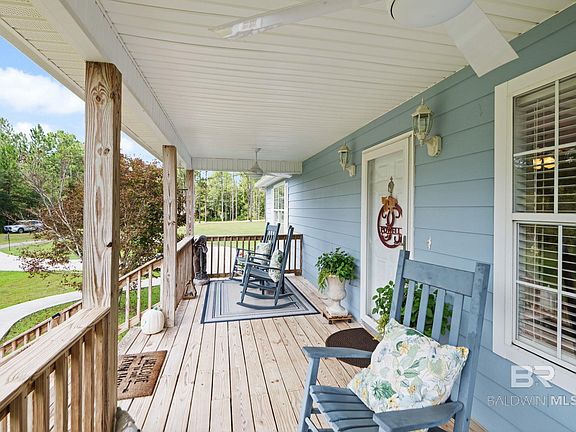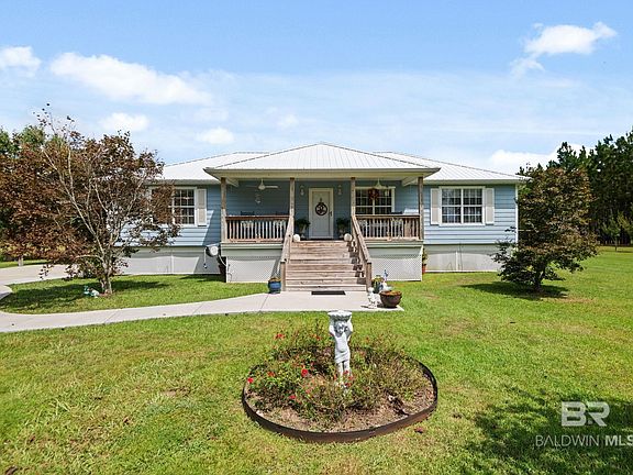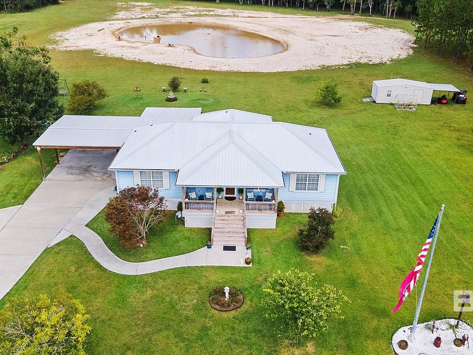 Welcome to your dream retreat nestled on 10 sprawling acres of secluded countryside! This custom-built home offers 1,882 square feet of thoughtfully designed living space and features a desirable split floor plan with 3 bedrooms and 2 bathrooms. Step inside to discover a beautifully updated interior, highlighted by a large kitchen with new appliances, sleek quartz countertops, and a spacious island that seamlessly connects to the living room. The home showcases ceramic tile in the bathrooms, rich hardwood flooring in the kitchen and living areas, and carpet in the bedrooms. Relax and entertain guests in the sunroom or on the covered back porch deck, which includes a relaxing built-in hot tub! A standout feature of this property is the half-acre, fully stocked pond shared with the adjoining property, perfect for fishing or simply soaking in the peaceful surroundings. Additional amenities include a convenient 2-car attached carport and storage shed. Located just minutes away from the Styx River, a gun range, and an ATV park, this home offers endless outdoor recreational opportunities. With easy access to Interstate 10, you're only a short drive from Mobile and Pensacola! Need more land and another house?Don't miss your chance to experience this extraordinary home, Schedule your showing today! All measurements are approximate and not guaranteed, buyer to verify. Home to be sold as is/where is. Buyer to verify all information during due diligence.
