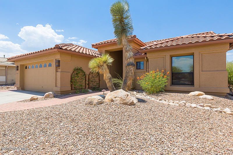 BEAUTIFUL natural setting, this home has a coveted south facing rear patio with an extended Ramada that faces an Arroyo (lots of bird & wildlife) with views of mountain tops, red sky sunsets & morning sunrises. It's the perfect place to enjoy morning coffee or entertain guests in evening light. An over-sized water feature and extended patio expand the living space of this two bedroom two bath home. With 18'' tile in all rooms (except second bedroom), hickory cabinets in kitchen & bath vanities, under cabinet lighting, upgraded lighting, security screen doors in both front & back for added breeze, new tile in master bedroom, 4' extended garage, canned lights in garage, new garage door springs, gutters, 2x6 construction, new water softener (2016), solar screens on east/west side.
