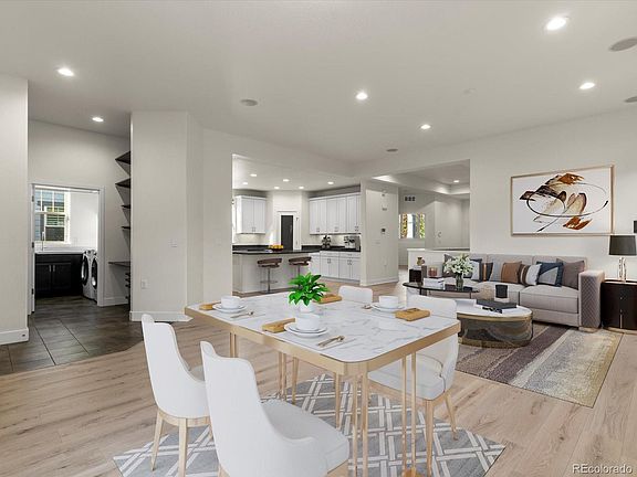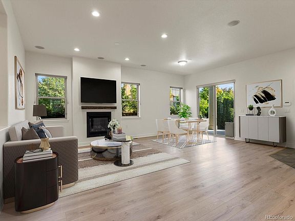 Perfectly positioned on a corner lot in Central Park’s coveted Eastbridge neighborhood, this exquisite 4-bedroom, 3-bath Boulder Creek ranch-style home embodies refined design and modern convenience. Thoughtfully crafted with ADA-compliant features, it showcases soaring 10-foot ceilings, brand-new wide-plank wood floors, built-in high end surround sound speakers, and an airy open-concept layout. The chef’s kitchen stuns with sleek gray quartz counters, abundant soft-close white cabinetry, stainless steel appliances, and a massive eat-up island, flowing effortlessly into the dining area and living room with a warm gas fireplace. The serene primary suite offers a spa-like bath with a curbless shower clad in beautiful brand-new floor tile, dual quartz sink vanity, and a walk-in closet with a custom closet system. A non-conforming bedroom or private office, a full bath, and a laundry room with a utility sink complete the main level. Downstairs, the finished basement impresses with a sprawling media room featuring built-in surround sound speakers and an included wall mounted television, subwoofer, and receiver. Two generously sized bedrooms, each with a walk-in closet, a bonus/workout/flex room with an egress window and wardrobe closet, and a stylish walk-in shower bath complete the basement level. Beyond the walls, a lush backyard sanctuary awaits with mature trees, curated blooms, and raised garden beds ready for seasonal planting. Additional highlights include a finished 2-car garage, whole-home steam humidifier, and tankless water heater. Just one block from the F-15 pool and park, and moments from Eastbridge Town Center, Stanley Marketplace, and miles of scenic trails, this home offers exceptional comfort in an unparalleled location.