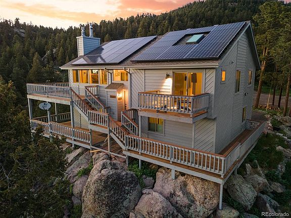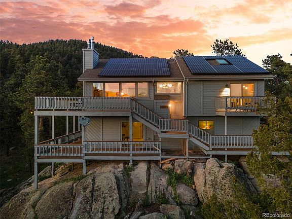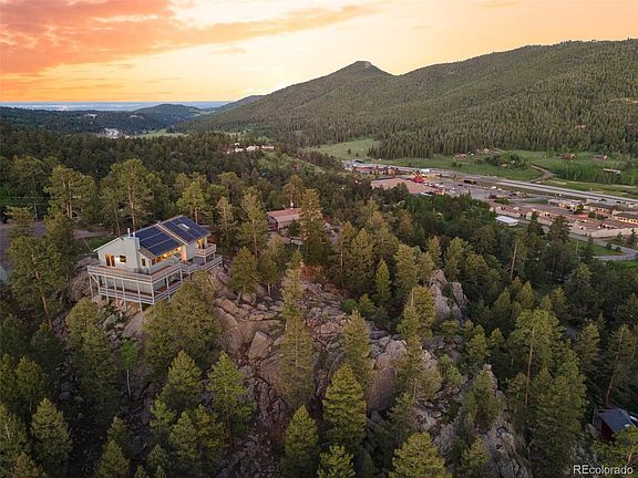 **LENDER PAID 1/0 temp buydown + $5000 SELLER PAID toward closing costs or buydown - SAVE UP TO $500/mo on mortgage payment. There is nothing like having that eagle's nest perspective over Aspen Park, perched on top of the magnificent rock outcroppings on over an acre lot that's been thoroughly fire mitigated. Stare off at Mt. Blue Sky from the expansive wrap-around deck. When you do come inside you'll be blown away by the meticulous consideration that was put into this complete home remodel! Every detail of high-efficiency upgrades meet you with lower costs, more comfortable living and smart features that make your life easier day to day. Owned LG panels with >90% efficiency in 24 years means you can expect negative core bills, allowing easy EV via Tesla wall charger. In addition to the low e 4 pane picture window, 3 pane sliders and skylights with point of use solar powered blinds (w/ rechargeable batteries), you're going to stay cooler in the summer months and warmer through the winter when you turn up that gas aspen log fireplace. The kitchen boasts a large island for entertaining, Deckton (outdoor rated) counters and backsplash, high-end cabinetry, Kitchen-Aid black stainless steel appliances and Spanish porcelain tile floors. The primary suite offers a timeless en-suite and walk-in closet, private balcony and sitting area to watch the sun over the mountains. New Mohawk carpet/pad made of stain-resistant recycled plastic water bottles is hypoallergenic. Two of the bathrooms have been fully remodeled with tile showers, new vanities, flooring and fixtures. 3 large bedrooms + additional office/flex room. There's a peace on this property that invites you in to stay but when you do need to leave, you're just 3 minutes to the grocery store, 20 minutes to Littleton with as easy of a commute as possible, straight down the mountain. It's time to live the mountain life you've been dreaming of, come see what Mosier street has to offer, you're guaranteed to be impressed!