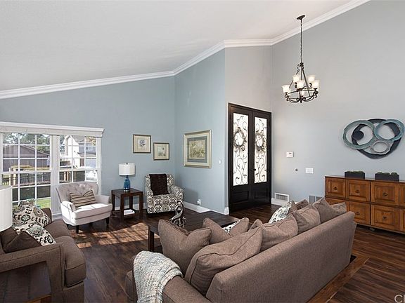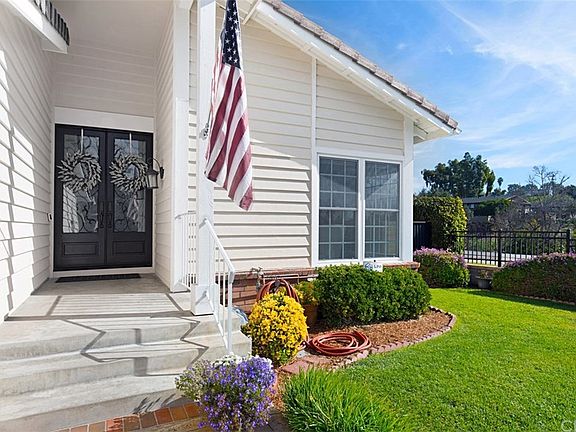 Pristine four bedroom, three bath home nestled at the end of a quiet cul de sac. Beautifully appointed throughout. Double glass entry doors lead into formal living and dining rooms with soaring cathedral ceilings. Crown moulding, custom interior painting. Engineered wood flooring. Gourmet kitchen with upgraded stainless steel appliances. Stone counters, glass backsplash, expresso custom cabinets. Plantation shutters. Breakfast nook with bay window. Opening to family room complete with fireplace and wet bar. Downstairs bedroom and full bath on main level. Picturesque private rear yard siding to Aliso Creek trail. Covered patio with built in Television, ceiling fans. Built-in BBQ, water feature, above ground spa. Upstairs is spacious master suite, dual closets, remodeled spa inspired master bath. Two good sized secondary bedrooms. Additional upgraded secondary bath. Nestled at the of a quiet cul de sac. Solar power completed paid. Water filtration system .Home has been re-pipped. Central A/C. This home truly checks all the boxes for the most discriminating buyer.