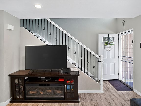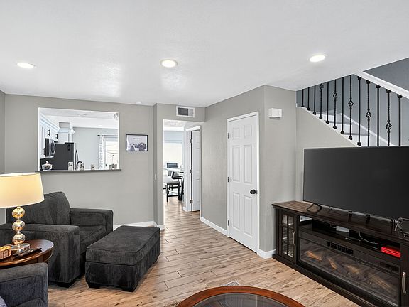 Open-Concept Living: A light-filled living room with recessed lighting, neutral gray tones, and wood-look flooring creates a welcoming atmosphere. The custom entertainment center with flat-screen TV and electric fireplace is ideal for cozy evenings.