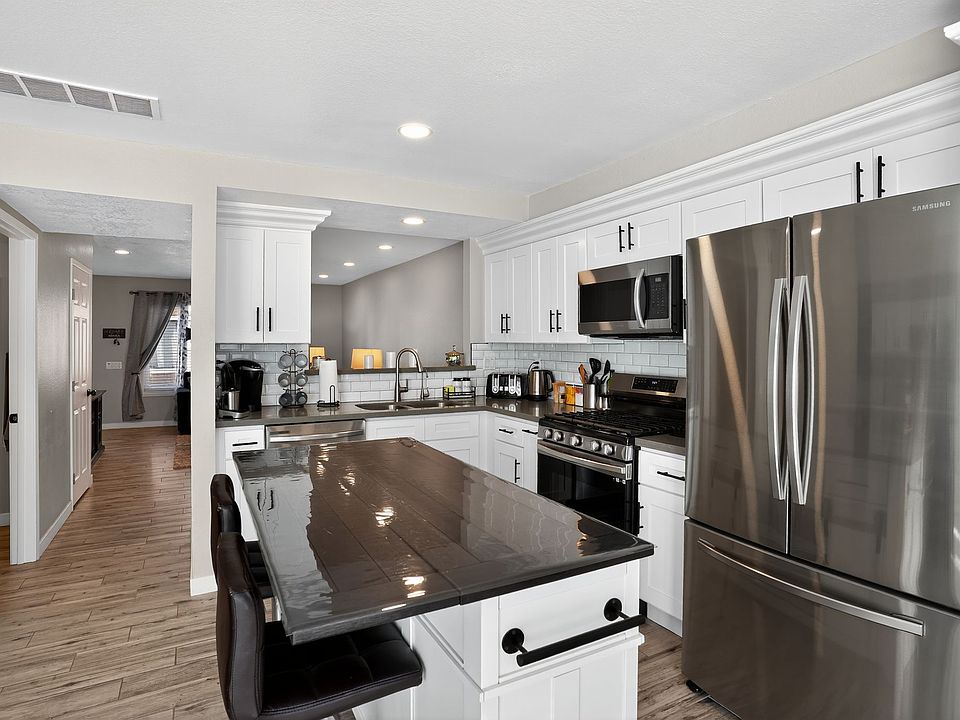 Chef's Kitchen: Featuring white cabinetry, gray subway tile backsplash, stainless steel appliances, and sleek countertops, this kitchen is both functional and stylish.