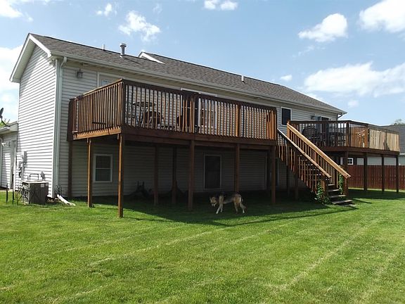 4 bedroom/3 bath bi-level in a great neighborhood next to the Trails. From dining area or master bedroom you could enter the large deck that spreads the length of the house, stairs leading to a fenced in yard accented by a newer shed. Kitchen with large island, master suite, cathedral ceilings and lower level with corner gas fireplace.