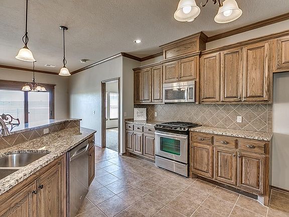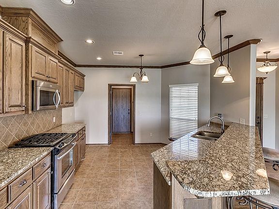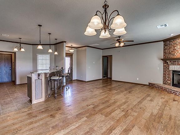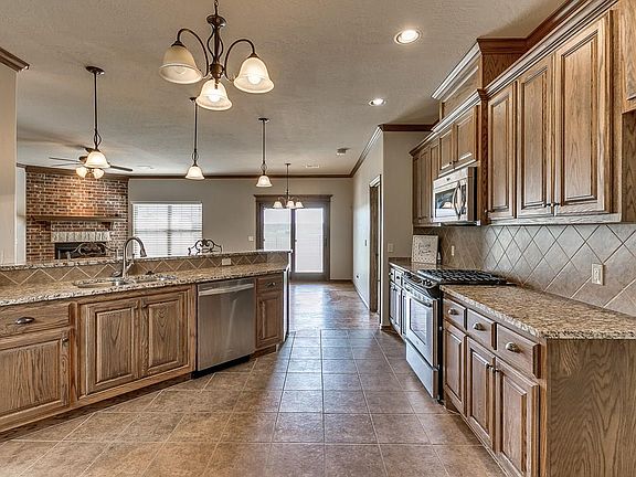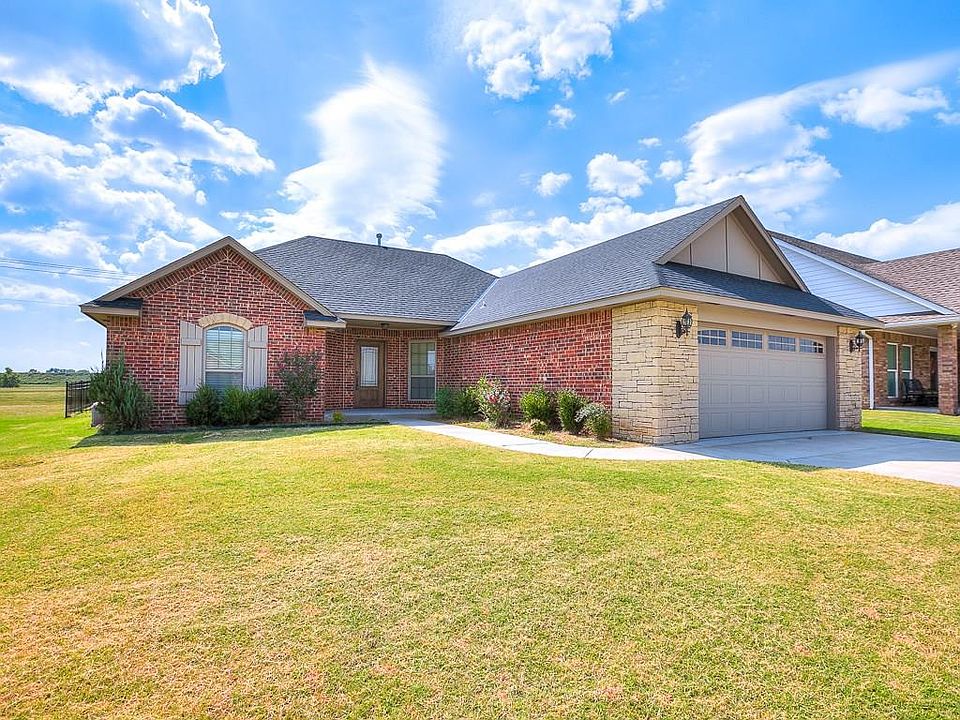 This beautifully crafted home offers open living/dining with granite counters, wood floors, eat at bar which is great for entertaining, great corner fireplace, stained woodwork throughout, split bedrooms and covered patio. The chef will love the stainless appliances in kitchen with gas cooking. Home is within walking distance to the park, lake and golf course and in a great neighborhood. Fence, Sprinkler system and safe storm room in garage have already been done for you.
