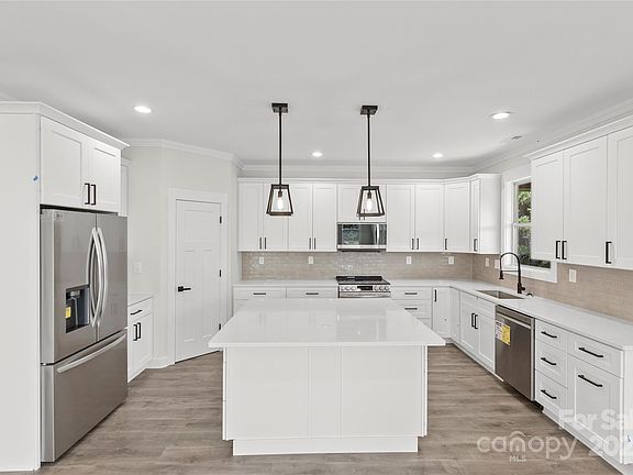 The chef’s kitchen is the centerpiece of the home, boasting tall soft-close cabinets and drawers, quartz countertops, and a walk-in pantry. The oversized island is what your dreams are made of. This is a large, expansive island. The kitchen is finished with a full LG upgraded stainless appliance package, including refrigerator, slide-in range with blue porcelain interior, microwave, and stainless-tub dishwasher. The primary suite is a private retreat, highlighted by tray ceilings, expanded windows, and a spacious walk-in closet. A 72” ceiling fan completes the room.