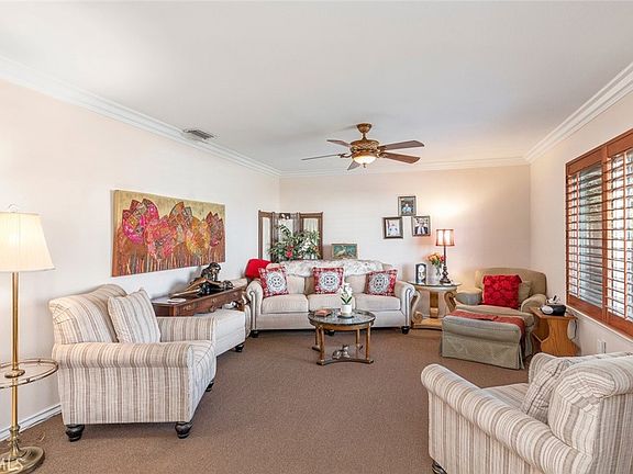 Bring your pickiest buyers to this home!!! Welcome to this stunning, highly upgraded, 3 bedroom (with one primary bedroom and one bedroom that's an ensuite and one normal bedroom), 3 bathroom, 2 car attached garage home located within a 55+ community of Sun City! As you walk up to the front door you are met with a spacious gated front porch area; entering the home you are greeted with an open floorplan, high ceilings and ceiling fans, elegant tile flooring, crown molding, plantation shutters throughout, dual pane windows, great room with a cozy brick fireplace, spacious kitchen with beautiful granite counters, barstool seating, plenty of cabinet and countertop space, stainless steel appliances and so much more! All three bedrooms are very generous in size including the the guest bedroom that has a private entry which makes it perfect for guests and the primary bedroom offers plenty of closet space, granite countertops with dual vanity sinks, soaking tub/shower duo, and so much more! Additional features of this home include a quiet-cool whole house fan, epoxy garage floors, and a large back patio with patio cover. There is a very large common grass area behind and to the side of this home. Sun City HOA offers indoor shuffleboard, fitness center, two pools, spa, lawn bowling, and a variety of club and social activities.