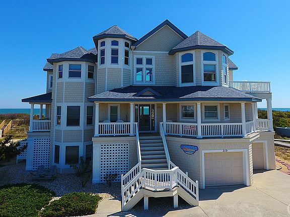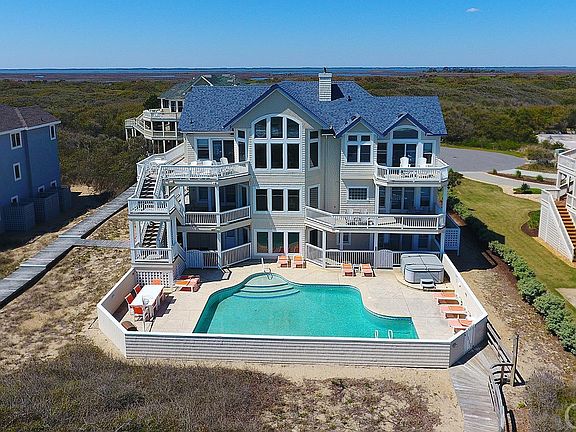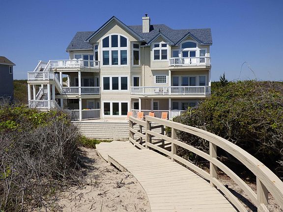 WOW : $180,000 PRICE REDUCTION !! MOTIVATED SELLER. High-end, well-maintained Oceanfront Home. Oversized rooms and living area. Originally built for second home luxury. Elevated, preferred X Flood Zone location. 100 feet of private dune frontage with unobstructed panoramic ocean views. Private ocean beach access walkway. 7 bedrooms/8.5 baths. 9 Ft ceilings. 2 car garage for easy dry entry and storage. 2 en suite bedrooms ( with water closet) on the ground floor with easy access to recreation room and pool area. Separate full bath for pool entry/exit. Mid-level has 4 bedrooms (3 with water closet) and a sizeable den/entertainment location. Large laundry room with double washer & dryer, additional shelving/storage. Covered deck access for all. The top floor has a spacious living area with flow through dining room/adjoining deck with exquisite views of the Currituck Sound. An open gourmet kitchen with gas cook top and convenient double appliances. Easy access to sun decks that look out at breathtaking views of the Atlantic sunrise and Currituck sound sunset. A stone surround gas fireplace will keep you cozy in the cooler winter months. In addition, there is a peaceful ships watch nook for more privacy. A large en suite bedroom (separate water closet ) with its own private oceanside deck for personal solitude. Separate office/sitting area close by. Comfortable passage to all 3 levels with interior elevator for safety and comfort.