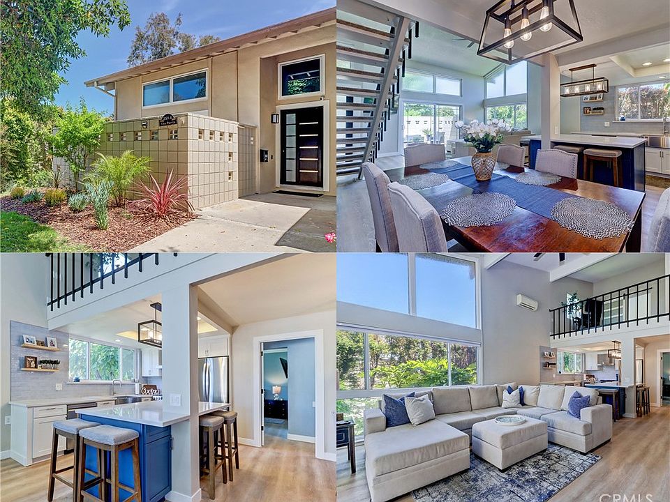plus an open loft. You'll love this bright home that receives afternoon sun and a lovely park-area in front featuring one of Laguna Woods beautiful mature trees provides a shady area to relax outside. Check out the Matterport tour to walk outside the front door and experience this great space! Walk right in through the contemporary front door with glass inserts and notice the soaring vaulted ceilings, huge dual pane windows, easy care vinyl plank flooring and great room feel with a beautiful open kitchen. The living room enjoys beautiful green views and natural light from the large windows and sliding doors leading out to the front patio. This spacious room contains one of the 2 ductless mini-split ductless HVAC, large ceiling fan and flows back to the open kitchen boasting contrasting shaker cabinets, quartz counters, recessed lights, stainless appliances with range hood, under counter microwave and large island with bar seating. Large window centered over the kitchen sink provides a great outlook! Adjacent dining space enjoys built-in buffet storage with glass-front cabinets and complementary modern light fixture. Downstairs primary suite features upgraded shaker doors, huge window, full-size stack washer/dryer in the bath hallway closet and a spa-like bathroom with dual sink vanity, tile floors, backlit mirror and glass-enclosed tile walk in shower. Heading upstairs, you'll love the good-sized open loft with sliding barn door to provide privacy for the upstairs primary bedroom behind. This room enjoys vaulted ceiling, ceiling fan, large window/slider leading to Juliet balcony. Upstairs primary bathroom has a modern touch with floating dual vanity, backlit mirror, walk-in closet with organizers and large walk-in shower with tile surround behind the privacy door. Great location close to carport and guest parking with a hedge in between the adjacent carports - there is not a sidewalk next the windows or carport siding to look at! CHECK OUT THE VIRTUAL WALK-THRU TOUR. CLICK THE WHITE CIRCLES TO WALK THROUGH, 360 ICON TO WALK OUTSIDE AND WALKING PERSON ICON TO COME BACK INSIDE. ENJOY!