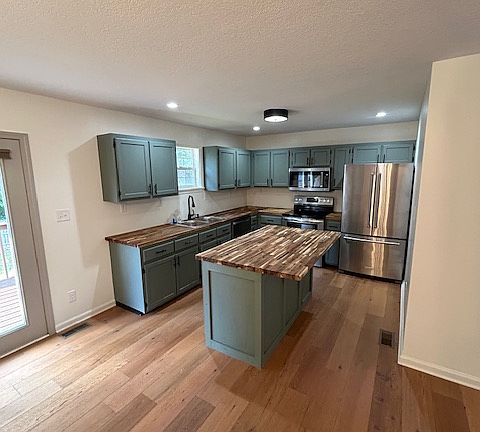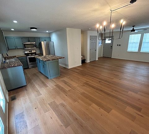 Gas heatCovered front porchNeutral paintButcher block islandFlat lotOpen floor planStainless steel appliances