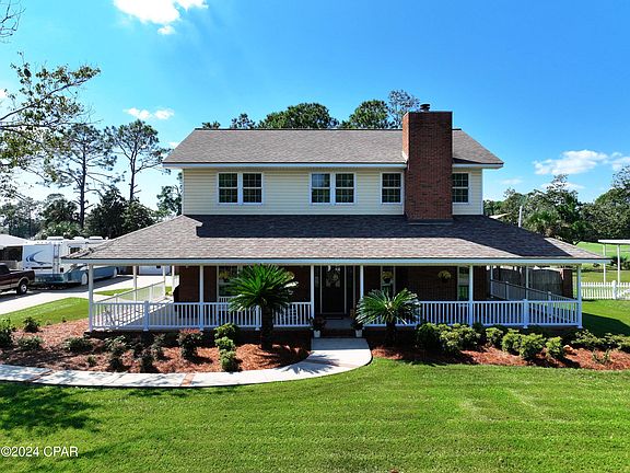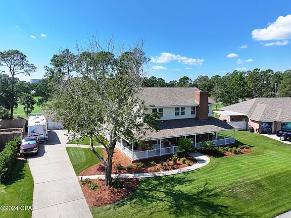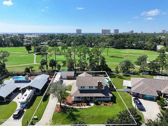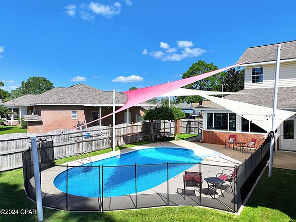Wow! It is a custom built, one owner brick home on a large lot (0.38 acre) in a quiet beach neighborhood- With large 8' wide elevated porch wraps around three sides, you will also enjoy a sun room overlooking the pool and golf course in back. Located in a Non-HOA community, Colony Club is known for being a part of Gayles Trails Trailhead. This great home is within 1 mile of the beach with access to the bypass road to Pier Park and to Frank Brown Park. You will enjoy the traffic-light access to US-98 and to FL-79 towards the new beach hospital and to the airport. The inground pool has a removable child safety fence and three sail shades. Power and water connections are in place for RV parking in the driveway and in the fenced backyard. Cherish the large 24 x 26 attached garage plus a brick finished detached 18 x 24 air conditioned garage/workshop with an additional 700SF of storage. This property has a well and an irrigation system. The home includes storm doors, windows, and garage doors. Gas fireplace logs are in the living room. Highlights include granite countertops, updated bathrooms and laundry room. Professional photos will be coming soon. Measurements are approximate and should be verified if important.