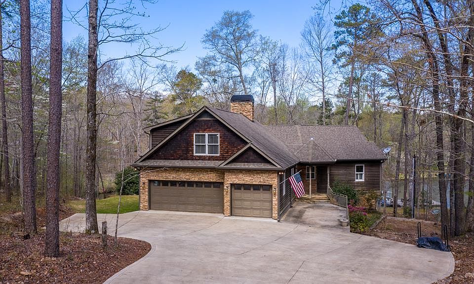 Estate Lake Oconee lakefront home being sold "as is". Open floor plan with updated finishes in mid-cove location, minutes away by boat to the "jumping off rock" near the dam in Putnam County. Main level boasts a central great room with hardwood floors, masonry gas fireplace, beamed cathedral ceiling, opens to an enclosed sunroom, with wide views of the lake. Cook's kitchen features just what you want and need: granite, s/s appliances, gas range, kitchen desk, and breakfast bar. Living area is flanked by 2 master bedrooms with ensuite baths, and 2 decks. A third bedroom with ensuite bath is located in the bonus room above the 3-car garage. Huge opportunity to build out the full terrace level to your liking. Central living plan as main level. Already in place is one partially-completed drywalled and stubbed bedroom with ensuite bath, and a studded 2nd bedroom also with a stubbed ensuite bath. Sufficient lakefront for a dock, with acceptable permitting via GA Power. Also available, abutting lot with max dock in place, MLS #.