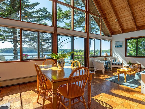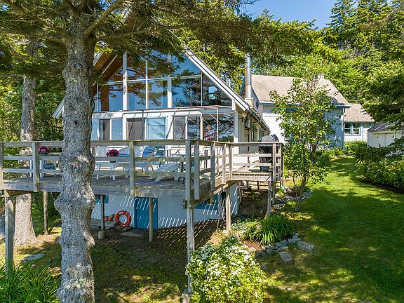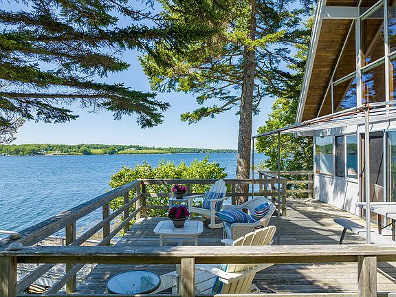 Escape to a quintessential Maine setting, where the gentle sea breeze beckons and lovely views await at this year-round home nestled on a generous lot with 130 feet of waterfront. The deep-water dock extends its welcome, inviting boating enthusiasts to embark on aquatic adventures or simply bask in the tranquility. With its west-facing orientation, this home is bathed in the sun's warm glow throughout the day. The water side of the house has an open living area, and sunlight cascades through the expansive windows, creating bright, sun-filled spaces. There is a first-floor bedroom, two second-floor bedrooms, and a galley kitchen. A newer addition encompasses an inviting mudroom, a fabulous great room, and a harmonious blend of sophistication and comfort. Centered around a granite fireplace, this inviting space exudes warmth and offers a cozy retreat during cooler evenings. No matter where you turn, lovely water views captivate the senses, reminding you of the natural beauty surrounding you. A truly idyllic setting.