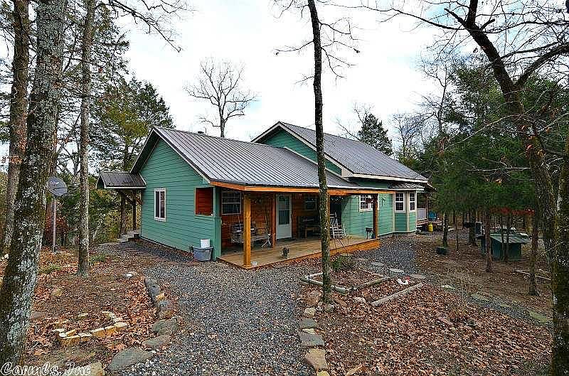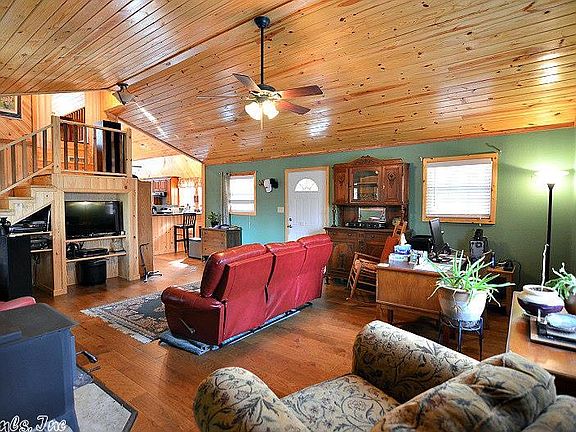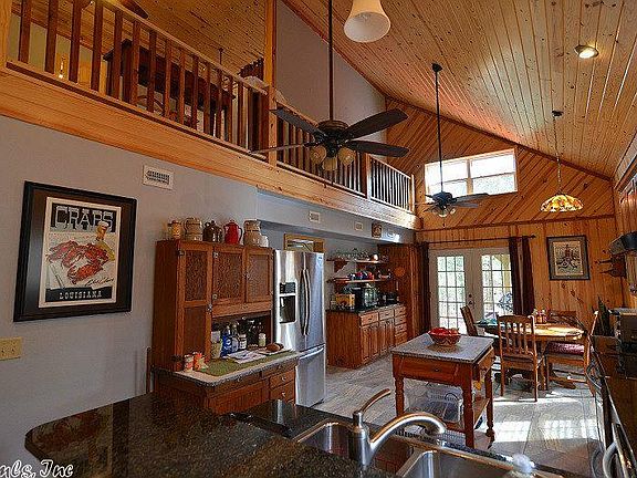 Stunning home with lots of wood features inside. Hardwood floors and wood, vaulted ceilings. Granite counter tops and ceramic tile flooring in kitchen with gorgeous, dark wood cabinetry. Pantry and bar area, stainless steel appliances and pretty light fixtures. Spacious living room, large bathroom with walk-in-shower. Laundry/mudroom. Loft bedroom with half bath. Covered porches, deck and hot tub. Chicken coop, shop and carport. Private setting, CREEK, woods and open areas, pond and gated entrance.