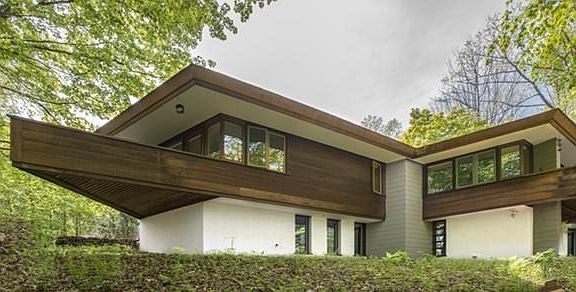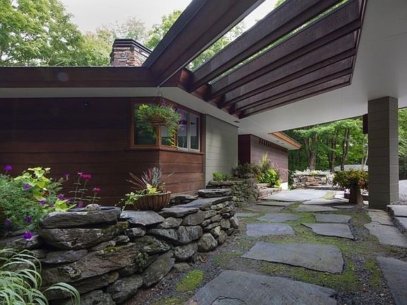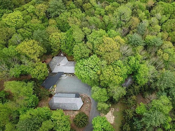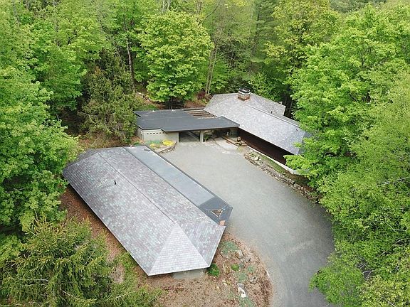 Set on 13+ acres overlooking a brook, this very special property was designed by John Bednarski, inspired by the the iconic architecture of Frank Lloyd Wright. It includes the main house plus detached guest suite, studio/retreat cabin with radiant floors that overlooks the stream below, a potting/machine shed, a great workshop, and an oversized two car-garage. The home incorporates beautiful natural materials both inside & out: cedar & copper exterior, slate roof & floors, old-growth cherry cabinetry and floors, and Ashfield stone. Architect-designed built-in furniture enhances every room; custom light fixtures & the fireplace surround reflect the design. Two Ipe decks are cantilevered out into the woods, one from the living area and the other from the gorgeous master suite which includes a walk-in closet, large full bath with whirlpool bath, separate shower, & towel warmers, and a custom bed, which remains. The open living area includes a fireplace as centerpiece, opposite glass doors out to the deck. Downstairs there's a media room/office that opens to the outside, a 2nd bedroom, great laundry room, & plenty of storage.