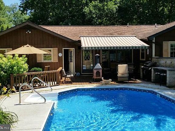 Beautiful Chalet well blended with surroundings on a partially wooded lot with small stream. Big great room features floor to ceiling brick fireplace, making the perfect place to relax. Eat-in kitchen features ample cabinets and counter space. Family room leads to private rear yard designed for entertaining on 15 x 20 wood deck with custom awning, and overlooking inground pool, koi pond, stream and built in BBQ area.
